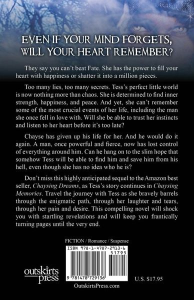 EVEN IF YOUR MIND FORGETS, WILL YOUR HEART REMEMBER? They say you can't beat Fate. She has the power to fill your heart with happiness or shatter it into a million pieces. Too many lies, too many secrets. Tess's perfect little world is now nothing more than chaos. She is determined to find inner strength, happiness, and peace. And yet, she can't remember some of the most crucial events of her life, including the man she once fell in love with. Will she be able to trust her instincts and listen to her heart before it's too late? Chayse has given up his life for her. And he would do it again. A man, once powerful and fierce, now has lost control of everything around him. Can he hang on to the slim hope that somehow Tess will be able to find him and save him from his hell, even though she has no idea who he is? Don't miss this highly anticipated sequel to the Amazon best seller, Chaysing Dreams, as Tess's story continues in Chaysing Memories. Travel the journey with Tess as she bravely barrels through the enigmatic path, through her laughter and tears, through her pain and desire. This compelling novel will shock you with startling revelations and will keep you frantically turning pages until the very end.