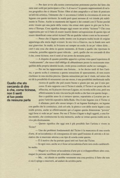 Che c'è di nuovo?, rassegna giunta quest'anno alla sua quarta edizione, ha quale obiettivo primario quello di dare visibilità ad artisti emergenti attivi in Ticino. Il metodo di selezione si è precisato nel tempo ed ha portato Che c'è di nuovo?, inteso inizialmente quale vetrina elaborata sul modello svizzero delle Jahresausstellungen (esposizioni annuali), ad assumere sempre più la fisionomia di una mostra curatoriale, capace di offrire uno spaccato su quanto di interessante si sta realizzando nel territorio. Das Urheberrecht an bibliographischen und produktbeschreibenden Daten und an den bereitgestellten Bildern liegt bei Informazioni Editoriali, I.E. S.r.l., oder beim Herausgeber oder demjenigen, der die Genehmigung erteilt hat. Alle Rechte vorbehalten.