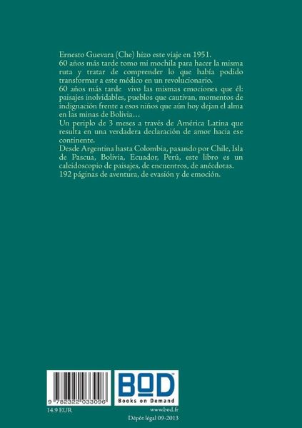 Ernesto Guevara (Che) hizo este viaje en 1951.60 años más tarde tomo mi mochila para hacer la misma ruta y tratar de comprender lo que había podido transformar a este médico en un revolucionario.60 años más tarde vivo las mismas emociones que él: paisajes inolvidables, pueblos que cautivan, momentos de indignación frente a esos niños que aún hoy dejan el alma en las minas de Bolivia Un periplo de 3 meses a través de América Latina que resulta en una verdadera declaración de amor hacia ese continente.Desde Argentina hasta Colombia, pasando por Chile, Isla de Pascua, Bolivia, Ecuador, Perú, este libro es un caleidoscopio de paisajes, de encuentros, de anécdotas.192 páginas de aventura, de evasión y de emoción.