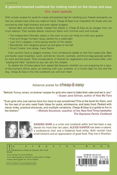 A gourmet-inspired cookbook for making meals on the cheap and easy Girl, meet spatula. With simple recipes for quick-fix meals and practical tips for stocking your freezer and pantry so that you always have what you need on hand, Cheap & Easy is an inspiration for those who are stymied by their tight kitchens and even tighter budgets. Sandra Bark and Alexis Kanfer created the dishes in Cheap & Easy as an escape from too much takeout. Their recipes deliver maximum flavor with minimal work and include: ¿ The Independent Pancake: bakes in the oven so you can hang out with your guests ¿ Fred and Ginger Pumpkin Soup: perfect for a weeknight ¿ Lazy Girl's Lasagna: a time-saving version of the classic ¿ Blenderella: the margarita grows up and goes to the ball ¿ Smart Cookie: one recipe, many flavors From comfort food to elegant entrées, from wholesome salads to that first sweet bite, Bark and Kanfer cover breakfast, lunch, and dinner; brunch; cocktails; and brown-bag specials perfect for work and the beach. They include plenty of choices for vegetarians and carnivores alike, with "playing the field" sections so you can vary the recipes. So delete the Chinese place from speed dial because whether you are preparing for a spur-of-the-moment dinner party, an evening with your sweetie, or a movie night for you and the dog, Cheap & Easy is the only cookbook you will ever need.