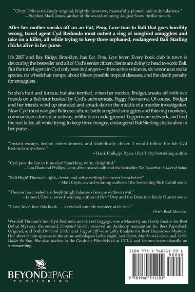 Winner of the Lefty Award for Best Humorous Mystery of 2023! "Cheap Trills is strikingly original, brightly inventive, masterfully plotted, and truly hilarious." -Stephen Mack Jones, author of the award-winning August Snow thriller novels After her mother sneaks off on an Eat, Pray, Love tour to Bali that goes horribly wrong, travel agent Cyd Redondo must outwit a ring of songbird smugglers and take on a killer, all while trying to keep three orphaned, endangered Bali Starling chicks alive in her purse. It's 2007 and Bay Ridge, Brooklyn, has Eat, Pray, Love fever. Every book club in town is devouring the bestseller and all of Cyd's senior citizen clients are dying to head to exotic Bali. But the travel agent in Cyd only sees its dangers-three active volcanos, six venomous snake species, no wheelchair ramps, about fifteen possible tropical diseases, and the death penalty for smugglers. So she's hurt and furious, but also terrified, when her mother, Bridget, sneaks off with two friends on a Bali tour booked by Cyd's archnemesis, Peggy Newsome. Of course, Bridget and her friends wind up stranded and smack dab in the middle of a murder investigation. Now Cyd must navigate Balinese culture, battle songbird smugglers and thieving monkeys, commandeer a funicular railway, infiltrate an underground Tupperware network, and find the real killer, all while trying to keep three hungry, endangered Bali Starling chicks alive in her purse . . . Praise for the Cyd Redondo Mysteries: "Instant escape, instant entertainment, and diabolically clever. I would follow the fab Cyd Redondo anywhere." -Hank Phillippi Ryan, USA Today bestselling author "Cyd puts the fun in funicular! Sparkling, witty, delightful." -Lou Diamond Phillips, actor, director and author of the bestseller The Tinderbox: Soldier of Indira "Bali High! Thomas's tight, clever, and witty writing has never been better!" -Matt Coyle, award-winning author of the bestselling Rick Cahill series "Thomas has created a sidesplittingly hilarious heroine without rival." -James L'Etoile, award-winning author of Dead Drop and the Detective Emily Hunter series "I love, love, love this book . . . screwball comedy mystery at its best." -Dru's Book Musings "Wendall Thomas is a magician, somehow imbuing the very serious subject of exotic bird poaching with humor, intrigue, exoticism and romance . . . the mystic island of Bali comes alive in the lively, intricately researched, and thoroughly entertaining mystery." -Baron R. Birtcher, LA Times bestseller and award-winning author of Reckoning and Fistful of Rain