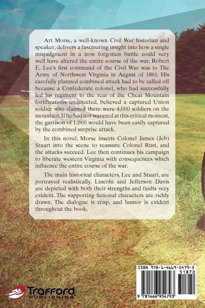 Art Morse, a well-known Civil War historian and speaker, delivers a fascinating insight into how a single misjudgment in a now forgotten battle could very well have altered the entire course of the war. Robert E. Lee's first command of the Civil War was to the army of northwest Virginia in August of 1861. His carefully planned combined attack had to be called off because a Confederate colonel, who had successfully led his regiment to the rear of the Cheat Mountain fortifications undetected, believed a captured Union soldier who claimed there were 4,000 soldiers on the mountain. If he had not wavered at this critical moment, the garrison of 1,000 would have been easily captured by the combined surprise attack. In this novel, Morse inserts Colonel James (Jeb) Stuart into the scene to reassure Colonel Rust, and the attacks succeed. Lee then continues his campaign to liberate western Virginia with consequences which influence the entire course of the war. The main historical characters, Lee and Stuart, are portrayed realistically. Lincoln and Jefferson Davis are depicted with both their strengths and faults very evident. The supporting fictional characters are richly drawn. The dialogue is crisp, and humor is evident throughout the book.