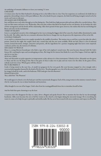 An anthology of romantic dalliances to leave you wanting "it" more CHEATERS A woman senses that her biker husband is cheating on her as she follows him to a bar. Once her suspicions are confirmed, she holds him at gunpoint, demanding to know of his past dalliances. But as he details his past conquests, she finds herself being strangely turned on by his stories and wants to take part. HE MAKES ME POWERLESS Jane and Brent meet each other through an on-line dating site...They both have high pressure jobs and want affairs for a needed release...They each use fake names and meet every Wednesday...But soon Jane realizes that Brent has found out her real identity...he has broken the rules of their arrangement and she breaks off the relationship. After short period of time apart, however, she realizes that she has real feelings for Brent and seeks out his real identity. THIEF OF HEARTS Lizzy is a young bank executive who is kidnapped on her way to closing the biggest deal of her career by a bank robber determined to make her his wife. The robber takes her on a romantic adventure that forever changes the way she perceives the importance of love in her life. COUPLES THERAPY A car crash in a rainstorm leaves two couples stranded in the middle of nowhere. The tension rises as each has a secret lust after the other's partner. Stuck for the night, the couples check into a motel that only has one room available...With one bed...There is a lot of awkward tension, heated discussion, intrigue, attraction and passion...All the ingredients for a partner swapping night that leaves some surprised, confused, and for one, the memory of a lifetime. SHE LIKED TO WATCH Elena is a young Mexican housekeeper who finds a tape of her rich employer's sexual trysts. She soon becomes obsessed with Mr. Gale's fantasy life, watching his tapes and eavesdropping on him...She longs for his interest but thinks he is out of her league...Until one night he asks her to stay late... SEXUAL CHESS Alana and Alexander are polar opposites in temperament as they advance in a chess tournament. Unlucky in love, Alexander sees the queen in Alana and she sees the King in him. But in the game of chess it takes two to play and one victor over the other. In the game of love, nobody need win or lose. Which game will they choose? PICTURE PERFECT Linda is being touted as the next Gia....A model too gorgeous for her own good...She soon becomes trapped in a love triangle with a renowned photographer haunted by the death of his first love. The photographer sees a lot of his deceased lover in Linda and tires to recreate her image in both his work...and in his bedroom. Will Linda give into his obsession? PHANTOM LOVE They called him "The Phantom." He would appear in church, sit in the back pew and then mysteriously disappear. Each of the young women in the ministry wanted to know who he was because he was so damn handsome and mysterious. Abby thought he was out of her league. Until a dare from her teasing girlfriends forces her to introduce herself to him. And she finds him quite charming to say the least. A mystery man who disappears for days at a time, drives a Bugatti and speaks French. Not to mention the fact that he was devastatingly handsome. Abby soon becomes the envy of all the women in the church as she begins dating the mercurial stranger. He is everything she wants in a man as he helps her grow spiritually and intellectually. She has never been treated with more tenderness and respect in all her life.