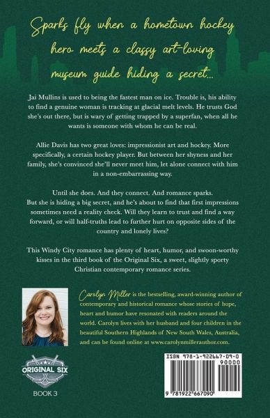 Sparks fly when a hometown hockey hero meets a classy art-loving museum guide hiding a secret... Jai Mullins is used to being the fastest man on ice. Trouble is, his ability to find a genuine woman is tracking at glacial melt levels. He trusts God she's out there, but is wary of getting trapped by a superfan, when all he wants is someone with whom he can be real. Allie Davis has two great loves: impressionist art and hockey. More specifically, a certain hockey player. But between her shyness and her family, she's convinced she'll never meet him, let alone connect with him in a non-embarrassing way. Until she does. And they connect. And romance sparks. But she is hiding a big secret, and he's about to find that first impressions sometimes need a reality check. Will they learn to trust and find a way forward, or will half-truths lead to further hurt and lonely lives on opposite sides of the country? This Windy City romance has plenty of heart, humor, and swoon-worthy kisses in the third book of the Original Six, a sweet, slightly sporty Christian contemporary romance series.