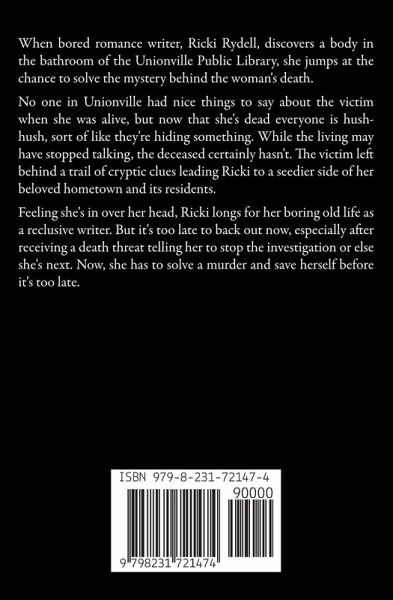 When bored and burnt-out romance writer, Ricki Rydell, stumbles upon a woman's body in the bathroom at her local library, she's in for the ride of her life. Because solving a murder is infinitely better than writing another book, isn't it? As she digs into the victim's life, Ricki uncovers secrets about people she thought she knew and learns there's a seedier side to her community that can make even a seasoned romance writer like herself blush. In over her head and longing for her boring old life as a reclusive writer, Ricki is on the trail of a killer and finding herself in more and more danger. Will Ricki solve this mystery before she becomes the next victim?