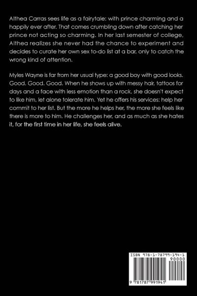 Althea Carras sees life as a fairytale: with prince charming and a happily ever after. That comes crumbling down after catching her prince not acting so charming. In her last semester of college, Althea realizes she never had the chance to experiment and decides to curate her own sex to-do list at a bar, only to catch the wrong kind of attention. Myles Wayne is far from her usual type: a good boy with good looks. Good. Good. Good. When he shows up with messy hair, tattoos for days and a face with less emotion than a rock, she doesn't expect to like him, let alone tolerate him. Yet he offers his services: help her commit to her list. But the more he helps her, the more she feels like there is more to him. He challenges her, and as much as she hates it, for the first time in her life, she feels alive.