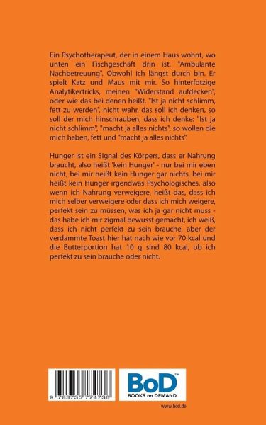 Hunger ist ein Signal des Körpers, dass er Nahrung braucht, also heißt 'kein Hunger' - nur bei mir eben nicht, bei mir heißt kein Hunger gar nichts, bei mir heißt kein Hunger irgendwas Psychologisches, also wenn ich Nahrung verweigere, dass das heißt, dass ich mich selber verweigere oder dass ich mich weigere, perfekt sein zu müssen, was ich ja gar nicht muss - das habe ich mir zigmal bewusst gemacht, ich weiß, dass ich nicht perfekt zu sein brauche, aber der verdammte Toast hier hat nach wie vor 70 kcal und die Butterportion hat 10 g sind 80 kcal, ob ich perfekt zu sein brauche oder nicht.