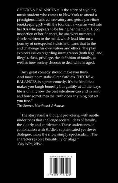 CHECKS & BALANCES tells the story of a young music student who comes to New York to attend a prestigious music conservatory and gets a part-time bookkeeping job with the founder, a woman well into her 80s who appears to be losing her memory. Upon inspection of her finances, he uncovers numerous checks written to the maid, which lead him on a journey of unexpected twists and turns that in the end challenge his own values and ethics. The play explores issues regarding immigration (both legal and illegal), class, privilege, the definition of family, as well as how society chooses to deal with its aged. "Any great comedy should make you think. And make no mistake, Oren Safdie's CHECKS AND BALANCES, is a great comedy. It's the kind that makes you laugh honestly but guiltily at all the ways life is unfair; how the best intentions can end in ruin; and how sometimes the truth does anything but set you free." The Source, Northwest Arkansas "The story itself is thought provoking, with subtle undertones that challenge societal ideas of family, the elderly and entitlement. These undertones, in combination with Safdie's sophisticated yet clever dialogue, make the show simply spectacular… The characters evolve beautifully on stage." City Wire, NWA