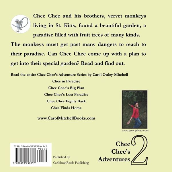 Chee Chee and his brothers, vervet monkeys living in St. Kitts, spend their days looking for food for the family. The brothers found a beautiful garden, a paradise filled with fruit trees of many kinds, but they must get past many dangers to reach to their paradise. Can Chee Chee come up with a plan to get them past the dangers and into their special garden? Read and find out.