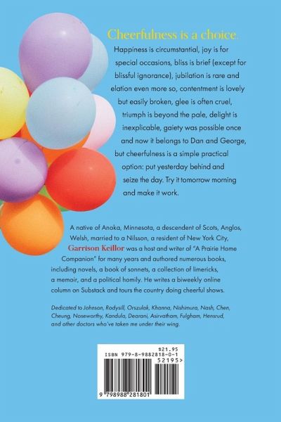 In Cheerfulness, veteran radio host and author Garrison Keillor reflects on a simple virtue that can help us in this stressful and sometimes gloomy era. Drawing on personal anecdotes from his young adulthood into his eighties, Keillor sheds light on the immense good that can come from a deliberate work ethic and a buoyant demeanor. "Adopting cheerfulness as a strategy does not mean closing your eyes to evil," he tells us; "it means resisting our drift toward compulsive dread and despond." Funny, poignant, thought-provoking, and whimsical, this is a book that will inspire you to choose cheerfulness in your daily life.