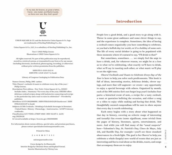 For every day of the year, Cheers! offers delicious cocktail recipes along with a backstory connecting the recipe to a particular day and a toast to raise in celebration. Greene draws on a range of interesting and (usually) fun events: some significant and some trivial, from the pages of history, literature, sports, entertainment, and more. Many of the toasts are classics culled from cocktail and bartending books dating to the nineteenth century, the works of Shakespeare, and other timeless sources.