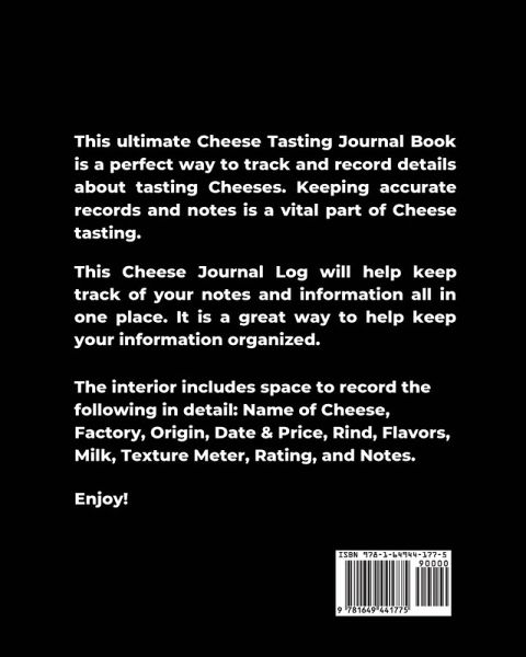 This Cheese Tasting Journal, diary is a great way to keep track of all your cheese tasting sessions. You can review your cheese tasting, write, & record your experience in this unique notebook. Will also make a perfect & wonderful gift for any cheese lover in your life. Each interior page contains space for: Name Of Cheese - Log the name of the cheese you are reviewing or recording. Factory - Which factory you purchased from. Origin, Date & Price - Write & mark where the cheese came from, the day, date and price you bought it for. Rind - (Bloomy, White, Soft, Fuzzy, Washed, Salty, Natural, Thick, Hard, Gritty, Dry) - with check mark boxes Flavors - (Salty, Sweet, Crystalline, Crumbly, Sharp/ Tangy, Milky/ Lactic, Lemon, Buttery/ Creamy, Grassy, Robust, Herbal, Skinky, Caramel, Moldy/ Blue, Nutty, Earthy). Milk - (Cow, Sheep, Goat, Raw, Other). Texture Meter - (Runny, Soft, Semi-Soft, Semi-Firm, Firm, Hard). Rating - Rate your experience with 1-5 stars. Notes - Blank lined space for writing any important information you like, for example if you tasted your cheese with milk, wine or beer, any ideas for eating new cheeses you may find, what inspired you, what you enjoy, which one you really liked & love, any thoughts, what type is your favorite, etc. Simple & easy to use. Funny cheese design. Great to take with you. Size is 8x10 inches, 110 pages, quality white paper, soft matte finish cover, paperback. Get one today!