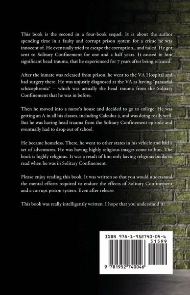 This book is the second in a four-book sequel. It is about the author spending time in a faulty and corrupt prison system for a crime he was innocent of. He eventually tried to escape the corruption... and failed. He got sent to Solitary Confinement for one and a half years. It caused in him significant head trauma, that he experienced for 7 years after being released. After the inmate was released from prison, he went to the VA Hospital and had surgery there. He was unjustly diagnosed at the VA as having "paranoid schizophrenia" - which was actually the head trauma from the Solitary Confinement that he was in before. Then he moved into a nurse's house and decided to go to college. He was getting an A in all his classes, including Calculus 2, and was doing really well. But he was having head trauma from the Solitary Confinement episode and eventually had to drop out of school. He became homeless. There, he went to other states in his vehicle and had a set of adventures. He was having highly religious images come to him. The book is highly religious. It was a result of him only having religious books to read when he was in Solitary Confinement. Please enjoy reading this book. It was written so that you would understand the mental efforts required to endure the effects of Solitary Confinement and a corrupt prison system. Even after release. This book was really intelligently written. I hope that you understand it!