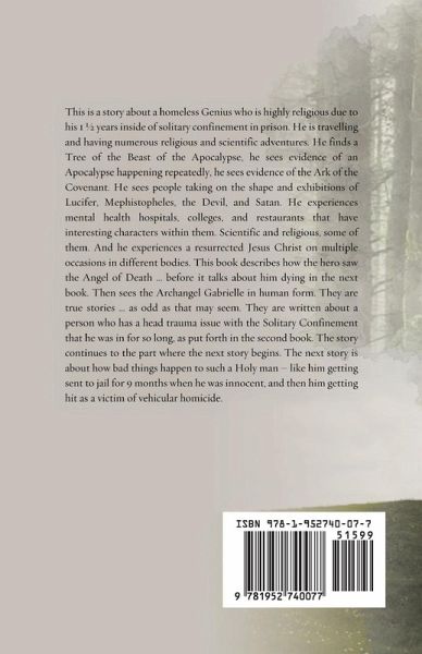 This is a story about a homeless Genius who is highly religious due to his 1 ¿ years inside of solitary confinement in prison. He is travelling and having numerous religious and scientific adventures. He finds a Tree of the Beast of the Apocalypse, he sees evidence of an Apocalypse happening repeatedly, he sees evidence of the Ark of the Covenant. He sees people taking on the shape and exhibitions of Lucifer, Mephistopheles, the Devil, and Satan. He experiences mental health hospitals, colleges, and restaurants that have interesting characters within them. Scientific and religious, some of them. And he experiences a resurrected Jesus Christ on multiple occasions in different bodies. This book describes how the hero saw the Angel of Death ... before it talks about him dying in the next book. Then sees the Archangel Gabrielle in human form. They are true stories ... as odd as that may seem. They are written about a person who has a head trauma issue with the Solitary Confinement that he was in for so long, as put forth in the second book. The story continues to the part where the next story begins. The next story is about how bad things happen to such a Holy man - like him getting sent to jail for 9 months when he was innocent, and then him getting hit as a victim of vehicular homicide.
