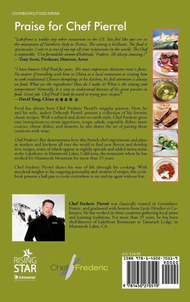 Food has always been Chef Frederic Pierrel's singular passion. Now, he and his wife, author Deborah Pierrel, present a collection of his favorite classic recipes. With a refined and down-to-earth style, Chef Frederic gives easy instructions to create appetizers, soups, salads, vegetable dishes, main courses, cheese dishes, and desserts; he also shares the art of pairing these creations with wine. Chef Frederic's Best demonstrates how this French chef experiments and plays in markets and kitchens all over the world to find new flavors and develop new recipes, some of which appear as nightly specials and added menu items at the Lakefront, in Mammoth Lakes, California, the restaurant where he has worked as a chef for the last ten years. Chef Frederic Pierrel shares his way of life through his cooking. With anecdotal insights to his outgoing personality and creation of recipes, this cookbook presents a hall pass to cooks everywhere to try and try again without fear.