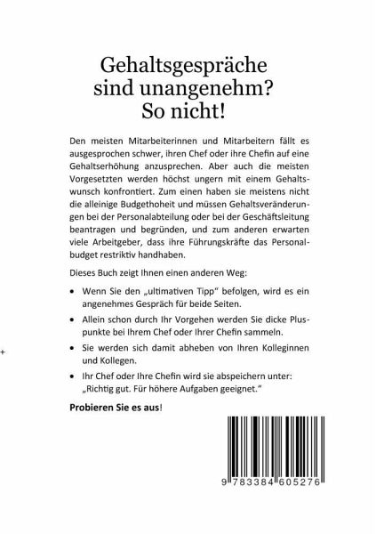 Gehaltsgespräche sind unangenehm? So nicht!Ob Sie die nächste Karrierestufe erklimmen wollen, ob Sie Prokura oder eine Führungsposition anstreben oder einfach nur eine Gehaltserhöhung wollen: So schaffen Sie es! Und wenn Sie es so nicht schaffen, dann schaffen Sie es vermutlich gar nicht.Den meisten Mitarbeiterinnen und Mitarbeitern fällt es ausgesprochen schwer, ihren Chef oder ihre Chefin auf eine Gehaltserhöhung anzusprechen. Aber auch die meisten Vorgesetzten werden höchst ungern mit einem Gehaltswunsch konfrontiert. Zum einen haben sie meistens nicht die alleinige Budgethoheit und müssen Gehaltsveränderungen bei der Personalabteilung oder bei der Geschäftsleitung beantragen und begründen, und zum anderen erwarten viele Arbeitgeber, dass ihre Führungskräfte das Personalbudget restriktiv handhaben.Dieses Buch zeigt Ihnen einen anderen Weg:-Wenn Sie den "ultimativen Tipp" befolgen, wird es ein angenehmes Gespräch für beide Seiten.-Allein schon durch Ihr Vorgehen werden Sie dicke Pluspunkte bei Ihrem Chef oder Ihrer Chefin sammeln.-Sie werden sich damit abheben von Ihren Kolleginnen und Kollegen.-Ihr Chef oder Ihre Chefin wird sie abspeichern unter:"Richtig gut. Für höhere Aufgaben geeignet."Probieren Sie es aus!