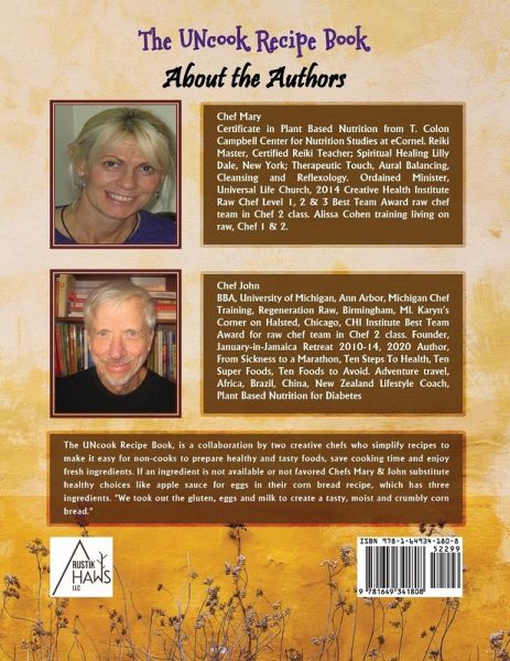 The UNcook Recipe Book, is a collaboration by two creative chefs who simplify recipes to make it easy for non-cooks to prepare healthy and tasty foods, save cooking time and enjoy fresh ingredients. If an ingredient is not available or not favored Chefs Mary & John substitute healthy choices like apple sauce for eggs in their corn bread recipe, which has three ingredients. "We took out the gluten, eggs and milk to create a tasty, moist and crumbly corn bread."