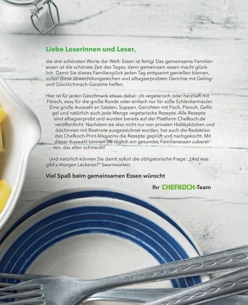 Familie ist, wenn alle glücklich beim Essen sitzen ...In diesem Buch haben wir für Sie 50 Rezepte aus dem Chefkoch-Magazin (diese sind auf der Plattform vielfach erprobt und von Usern weiterempfohlen) zusammengestellt, die zeigen, wie unendlich vielfältig die Möglichkeiten sind, jedem Familienmitglied am Essenstisch ein Lächeln aufs Gesicht zu zaubern. Die Bandbreite ist riesig: Vom Bayernburger über vegetarisch gefüllte Cannelloni bis hin zum Erdbeertiramisu, dazu eine große Auswahl an Salaten, Suppen, Gerichten mit Fisch, Fleisch, Geflügel und natürlich auch jede Menge vegetarische Rezepte. Und da alle Rezepte auf der beliebten Chefkoch-Plattform mit Bestnoten versehen und vom Chefkoch-Team erprobt und nachgekocht wurden, können Sie sicher sein, dass Ihnen die Zubereitung dieser familiären Gaumenfreuden garantiert gelingt!