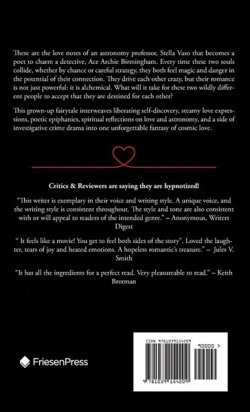 These are the love notes of an astronomy professor, Stella Vaso that becomes a poet to charm a detective, Ace Archie Birmingham. Every time these two souls collide, whether by chance or careful strategy, they both feel magic and danger in the potential of their connection. They drive each other crazy, but their romance is not just powerful: it is alchemical. What will it take for these two wildly different people to accept that they are destined for each other? This grown-up fairytale interweaves liberating self-discovery, steamy love expressions, poetic epiphanies, spiritual reflections on love and astronomy, and a side of investigative crime drama into one unforgettable fantasy of cosmic love.