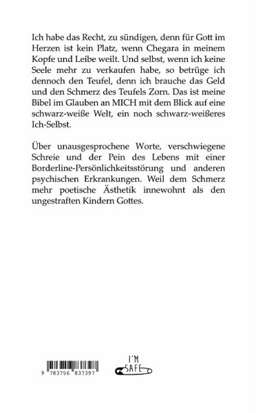 Ich habe das Recht zu sündigen, denn für Gott im Herzen ist kein Platz, wenn Chegara in meinem Kopfe und Leibe weilt. Und selbst, wenn ich keine Seele mehr zu verkaufen habe, so betrüge ich dennoch den Teufel, denn ich brauche das Geld und den Schmerz des Teufels Zorn. Das ist meine Bibel im Glauben an MICH mit dem Blick auf eine schwarz-weiße Welt, ein noch schwarz-weißeres Ich-Selbst.Über unausgesprochene Worte, verschwiegene Schreie und der Pein des Lebens mit einer Borderline-Persönlichkeitsstörung und anderen psychischen Erkrankungen. Weil dem Schmerz mehr poetische Ästhetik innewohnt als den ungestraften Kindern Gottes.