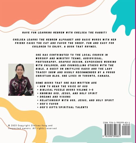 Have fun learning Hebrew with Chelsea the Rabbit! Chelsea learns the Hebrew alphabet and basic words with her friend Caius the Cat, Favor the Sheep, and Gracious the Lion. Fun and easy for children to enjoy which includes adorable illustrations. This is a beginner's book for anyone interested in learning Hebrew.