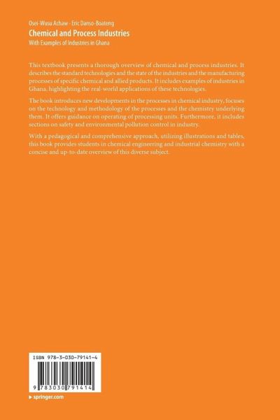 This textbook presents a thorough overview of chemical and process industries. It describes the standard technologies and the state of the industries and the manufacturing processes of specific chemical and allied products. It includes examples of industries in Ghana, highlighting the real-world applications of these technologies. The book introduces new developments in the processes in chemical industry, focuses on the technology and methodology of the processes and the chemistry underlying them. It offers guidance on operating of processing units. Furthermore, it includes sections on safety and environmental pollution control in industry.With a pedagogical and comprehensive approach, utilizing illustrations and tables, this book provides students in chemical engineering and industrial chemistry with a concise and up-to-date overview of this diverse subject.