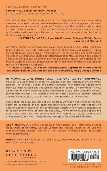 In warfare, civil unrest, and political protest, chemicals have served as means of coercion, suppression, and manipulation. This book examines how chemical agents have been justified, utilised and resisted as means of control. Through attending to how, when, and for whom bodies become rendered as sites of intervention, Chemical Bodies demonstrates the inter-relations between geopolitical transformations and the technological, spatial and social components of local events. The chapters draw out some of the insidious ways in which chemical technologies are damaging, and re-open discussion regarding their justification, role and regulation. In doing so the contributors illustrate how certain instances of force gain prominence (or fade into obscurity), how some individuals speak and others get spoken for, how definitions of what counts as 'success' and 'failure' are advanced, and how the rights and wrongs of violence are contested.