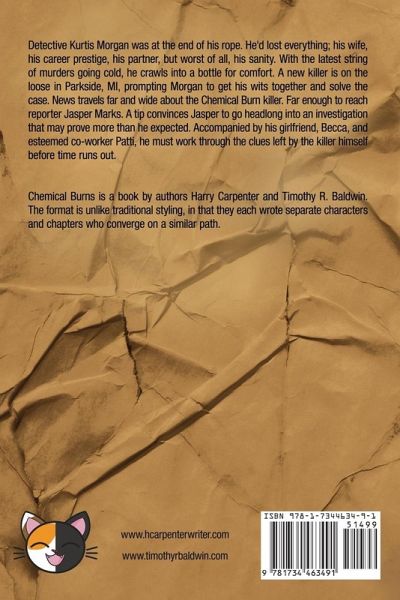 Detective Kurtis Morgan was at the end of his rope. He'd lost everything; his wife, his career prestige, his partner, but worst of all, his sanity. With the latest string of murders going cold, he crawls into a bottle for comfort. A new killer is on the loose in Parkside, MI, prompting Morgan to get his wits together and solve the case. News travels far and wide about the Chemical Burn killer. Far enough to reach reporter Jasper Marks. A tip convinces Jasper to go headlong into an investigation that may prove more than he expected. Accompanied by his girlfriend, Becca, and esteemed co-worker Patti, he must work through the clues left by the killer himself before time runs out. Chemical Burns is a book by authors Harry Carpenter and Timothy R. Baldwin. The format is unlike traditional styling in that they each wrote separate characters and chapters that converged on a similar path.