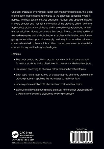 Uniquely organized by chemical rather than mathematical topics, this book relates each mathematical technique to the chemical concepts where it applies. The new edition features additional, revised, and updated material in every chapter and maintains the clarity of the previous edition with the appropriate organization of topics and improved cross-referencing where mathematical techniques occur more than once. The text contains additional worked examples and end-of-chapter exercises with detailed solutions giving students the opportunity to apply previously introduced techniques to chemically related problems. It is an ideal course companion for chemistry courses throughout the length of a degree.