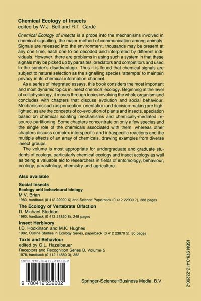 Our objective in compiling a series of chapters on the chemical ecology of insects has been to delineate the major concepts of this discipline. The fine line between presenting a few topics in great detail or many topics in veneer has been carefully drawn, such that the book contains sufficient diversity to cover the field and a few topics in some depth. After the reader has penetrated the crust of what has been learned about chemical ecology of insects, the deficiencies in our understanding of this field should become evident. These deficiencies, to which no chapter topic is immune, indicate the youthful state of chemical ecology and the need for further investigations, especially those with potential for integrating elements that are presently isolated from each other. At the outset of this volume it becomes evident that, although we are beginning to decipher how receptor cells work, virtually nothing is known of how sensory information is coded to become relevant to the insectand to control the behavior of the insect. This problem is exacerbated by the state of our knowledge of how chemicals are distributed in nature, especially in complex habitats. And finally, we have been unable to understand the significance of orientation pathways of insects, in part because of the two previous problems: orientation seems to depend on patterns of distri bution of chemicals, the coding of these patterns by the central nervous system, and the generation of motor output based on the resulting motor commands.
