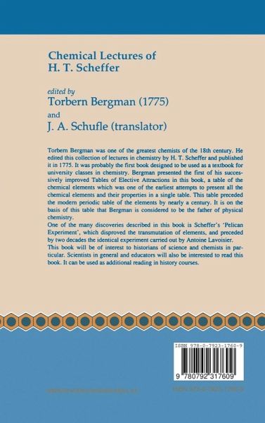 Torbern Bergman was one of the greatest chemists of the 18th century. He edited this collection of lectures in chemistry by H.T. Scheffer and published it in 1775. It was probably the first book designed to be used as a textbook for university classes in chemistry. Bergman presented the first of his successively improved Tables of Elective Attractions in this book, a table of the chemical elements which was one of the earliest attempts to present all the chemical elements and their properties in a single table. This table preceded the modern periodic table of the elements by nearly a century. It is of basis of this table that Bergman is considered to be the father of physical chemistry.