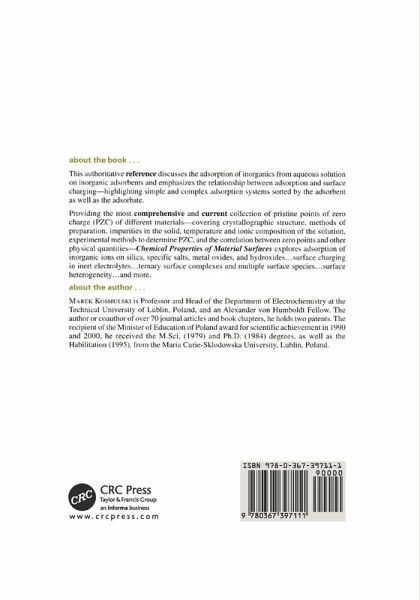 A discussion of the adsorption of inorganics from aqueous solution on inorganic adsorbents. It emphasizes the relationship between adsorption and surface charging, highlighting simple and complex adsorption systems sorted by the adsorbent as well as the adsorbate. The author includes a comprehensive collection of pristine PZC of different materials - covering crystallographic structure, methods of preparation, impurities in the solid, temperature and ionic composition of the solution, experimental methods to determine PZC, and the correlation between zero points and other physical quantities.