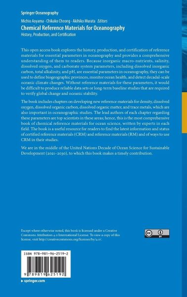 The book includes chapters on developing new reference materials for density, dissolved oxygen, dissolved organic carbon, dissolved organic matter, and trace metals, which are also important in oceanographic studies. The lead authors of each chapter regardingthese parameters are top scientists in these areas; hence, this is the most comprehensive book of chemical reference materials for ocean science, written by experts in each field. The book is a useful resource for readers to find the latest information and status of certified reference materials (CRM) and reference materials (RM) and of ways to use CRM in their studies.