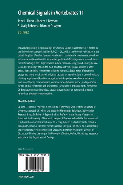 New Directions in Semiochemistry.- Volatile Mammalian Chemosignals: Structural and Quantitative Aspects.- Use of Automated Solid Phase Dynamic Extraction (SPDE)/GC-MS and Novel Macros in the Search for African Elephant Pheromones.- Urinary Lipocalins in Rodenta:is there a Generic Model?.- The Biological Function of Cauxin, a Major Urinary Protein of the Domestic Cat (Felis catus).- Putative Pheromones of Lion Mane and Its Ultrastructure.- Olfactory Response and Function.- Using Ethologically Relevant Tasks to Study Olfactory Discrimination in Rodents.- Comparisons of State and Likelihood of Performing Chemosensory Event Behaviors in Two Populations of African Elephants (Loxodonta africana).- Olfactory Communication in the Ringtailed Lemur (Lemur catta): Form and Function of Multimodal Signals.- Olfaction in the Gorilla.- Ecological Validity in the Study of Human Pheromones.- The Influence of Sexual Orientation on Human Olfactory Function.- Recognition within Species: Individual, Sex, Group.- MHC-Associated Chemosignals and Individual Identity.- Pregnancy Block from a Female Perspective.- The Wing-Sac Odour of Male Greater Sac-Winged Bats Saccopteryx bilineata (Emballonuridae) as a Composite Trait: Seasonal and Individual Differences.- Gender Specific Expression of Volatiles in Captive Fossas (Cryptoprocta ferox) During the Mating Season.- Do Spotted Hyena Scent Marks Code for Clan Membership?.- The Ontogeny of Pasting Behavior in Free-living Spotted Hyenas, Crocuta crocuta.- Human Body Odour Individuality.- Environmental Effects on Human Body Odour.- Sexual Communication.- A Candidate Vertebrate Pheromone, SPF, Increases Female Receptivity in a Salamander.- Cross-dressing in Chemical Cues: Exploring 'She-maleness' in Newly-emerged Male Garter Snakes.- TheNeurobiology of Sexual Solicitation: Vaginal Marking in Female Syrian Hamsters (Mesocricetus auratus).- Olfactory Control of Sex-Recognition and Sexual Behavior in Mice.- The Role of Early Olfactory Experience in the Development of Adult Odor Preferences in Rodents.- Have Sexual Pheromones Their Own Reward System in the Brain of Female Mice?.- The Effect of Familiarity on Mate Choice.- Age of the Subject and Scent Donor Affects the Amount of Time that Voles Self-Groom When They are Exposed to Odors of Opposite-sex Conspecifics.- Scent, Mate Choice and Genetic Heterozygosity.- Maternal - Offspring Communication.- Psychobiological functions of the mammary pheromone in newborn rabbits.- Rabbit Nipple-Search Pheromone Versus Rabbit Mammary Pheromone Revisited.- The Human Breast as a Scent Organ: Exocrine structures, Secretions, Volatile Components, and Possible Functions in Breastfeeding Interactions.- Responses of Pre-term Infants to the Odour of Mother's Milk.- Communication between Species, Predators and Prey.- Patterns of Tongue-Flicking by Garter Snakes (Thamnophis sirtalis) during Presentation of Chemicals under Varying Conditions.- Multi-Contextual use of Chemosignals by Liolaemus Lizards.- Selective Response of Medial Amygdala Subregions to Reproductive and Defensive Chemosignals from Conspecific and Heterospecific Species.- Seasonal Responses to Predator Faecal Odours in Australian Native Rodents Vary Between Species.- Applications.- A Critical Review of Zoo-based Olfactory Enrichment.- Pig Semiochemicals and Their Potential for Feral Pig Control in NE Australia.- Use of Chemical Ecology for Control of the Cane Toad?.