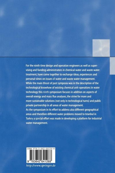 For the ninth Gothenburg Symposium time design and operation engineers as well as supervising and funding administrators in chemical water and waste water treatment, have come together to exchange ideas, experiences and personal views on issues of water and waste water management. While the main thrust of past symposia was in the description of the technological know-how of existing chemical unit-operations in water technology this ninth symposium focuses in addition on aspects of overall energy and mass flux analyses, the strive for more and more sustainable solutions (not only in technological turns) and public private partnership in all areas of water management. As the symposium in its effort to address also different geographical areas and therefore different water problems moved to Istanbul in Turkey a special effort was made in developing a platform for industrial water management.