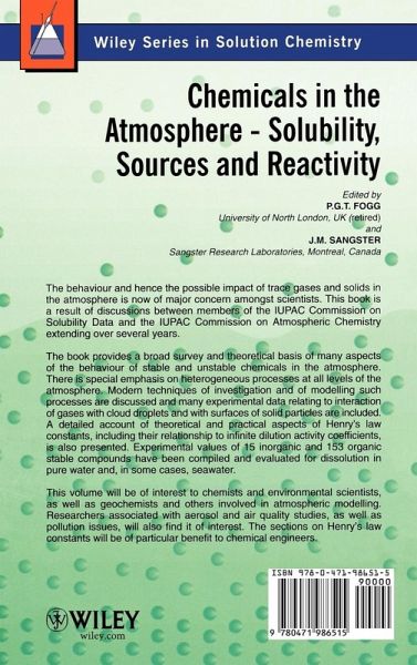 List of Contributors. Preface. Introduction. Chapter 1: General Behaviour and Origins of Greenhouse and Significant Trace Gases. Chapter 2: Presentation of Solubility Data: Units and Applications. Chapter 3: Thermodynamic Aspects of Henry's Law. Chapter 4: The Experimental Measurement of Henry's Law Constant. Chapter 5: Calculation of Henry's Law Constants and Infinite Dilution Activity Coefficients - An Overview. Chapter 6: Details of Specific Methods of Predicting the Solubility of Organic Compounds in Water. Chapter 7: Solubility of Gases in Strong Electrolyte Solutions. Chapter 8: Details and Measurement of Factors Determining the Uptake of Gases by Water. Chapter 9: Accommodation Coefficients, Uptake Coefficients and Henry's Law Constants of Gases which React with Water or are Unstable. Chapter 10: Solid Particulates and Surface Reactions in the Atmosphere. Chapter 11: Henry's Law Constants for Compounds Stable in Water. Chapter 12: Henry's Law Constants for Dissolution in Seawater. Appendix I: A Selection of Sources of Additional Data Currently Available from the Internet. Appendix II: Dissolution of Carbon Dioxide and of Oxygen and Fractionation of Oxygen Isotopes in the Environment. CAS Registry Index. Subject Index.