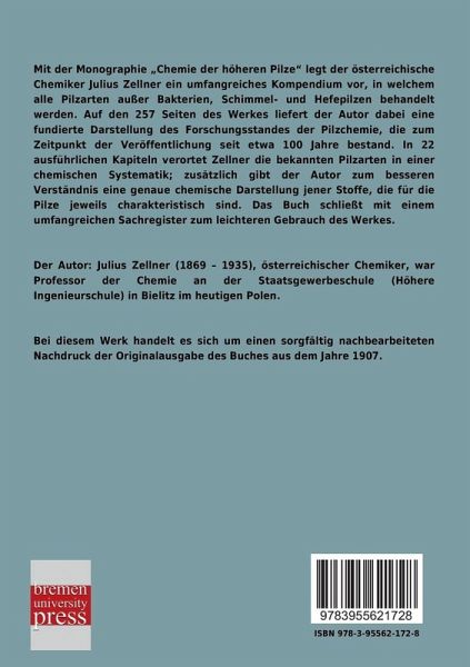 Mit der Monographie Chemie der höheren Pilze legt der österreichische Chemiker Julius Zellner ein umfangreiches Kompendium vor, in welchem alle Pilzarten außer Bakterien, Schimmel- und Hefepilzen behandelt werden. Auf den 257 Seiten des Werkes liefert der Autor dabei eine fundierte Darstellung des Forschungsstandes der Pilzchemie, die zum Zeitpunkt der Veröffentlichung seit etwa 100 Jahre bestand. In 22 ausführlichen Kapiteln verortet Zellner die bekannten Pilzarten in einer chemischen Systematik; zusätzlich gibt der Autor zum besseren Verständnis eine genaue chemische Darstellung jener Stoffe, die für die Pilze jeweils charakteristisch sind. Das Buch schließt mit einem umfangreichen Sachregister zum leichteren Gebrauch des Werkes.