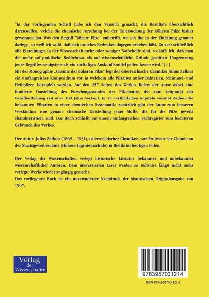 Mit der Monographie Chemie der höheren Pilze legt der österreichische Chemiker Julius Zellner ein umfangreiches Kompendium vor, in welchem alle Pilzarten außer Bakterien, Schimmel- und Hefepilzen behandelt werden. Auf den 257 Seiten des Werkes liefert der Autor dabei eine fundierte Darstellung des Forschungsstandes der Pilzchemie, die zum Zeitpunkt der Veröffentlichung seit etwa 100 Jahre bestand. In 22 ausführlichen Kapiteln verortet Zellner die bekannten Pilzarten in einer chemischen Systematik; zusätzlich gibt der Autor zum besseren Verständnis eine genaue chemische Darstellung jener Stoffe, die für die Pilze jeweils charakteristisch sind. Das Buch schließt mit einem umfangreichen Sachregister zum leichteren Gebrauch des Werkes.
