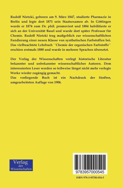 Rudolf Nietzki, geboren am 9. März 1847, studierte Pharmazie in Berlin und legte dort 1871 sein Staatsexamen ab. In Göttingen wurde er 1874 zum Dr. phil. promoviert und 1884 habilitierte er sich an der Universität Basel und wurde dort später Professor für Chemie. Rudolf Nietzki trug maßgeblich zur wissenschaftlichen Fundierung einer neuen Klasse von synthetischen Farbstoffen bei. Das vielbeachtete Lehrbuch ``Chemie der organischen Farbstoffe`` erschien erstmals 1888 und wurde in mehrere Sprachen übersetzt.