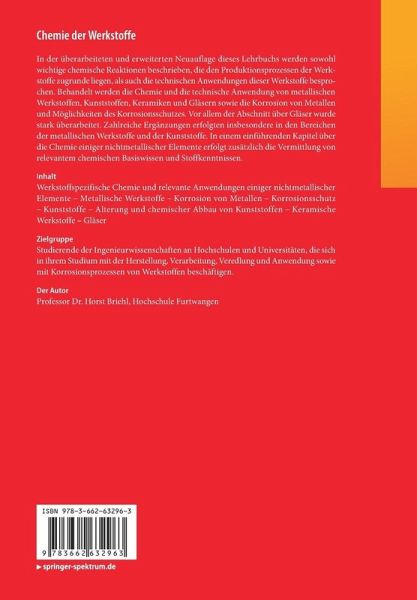 In der überarbeiteten und erweiterten Neuauflage dieses Lehrbuchs werden sowohl wichtige chemische Reaktionen beschrieben, die den Produktionsprozessen der Werkstoffe zugrunde liegen, als auch die technischen Anwendungen dieser Werkstoffe besprochen. Behandelt werden die Chemie und die technische Anwendung von metallischen Werkstoffen, Kunststoffen, Keramiken und Gläsern sowie die Korrosion von Metallen und Möglichkeiten des Korrosionsschutzes. Vor allem der Abschnitt über Gläser wurde stark überarbeitet. Zahlreiche Ergänzungen erfolgten insbesondere in den Bereichen der metallischen Werkstoffe und der Kunststoffe. In einem einführenden Kapitel über die Chemie einiger nichtmetallischer Elemente erfolgt zusätzlich die Vermittlung von relevantem chemischen Basiswissen und Stoffkenntnissen.
