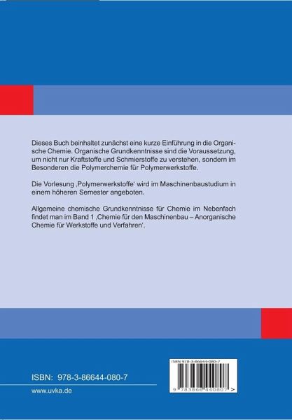 Dieses Buch beinhaltet zunächst eine kurze Einführung in die Organische Chemie. Organische Grundkenntnisse sind die Voraussetzung, um nicht nur Kraftstoffe und Schmierstoffe zu verstehen, sondern im Besonderen die Polymerchemie für Polymerwerkstoffe. Die Vorlesung "Polymerwerkstoffe" wird im Maschinenbaustudium in einem höheren Semester angeboten. Allgemeine chemische Grundkenntnisse für Chemie im Nebenfach findet man im Buch 1 "Chemie für Maschinenbau - Anorganische Chemie für Werkstoffe und Verfahren".