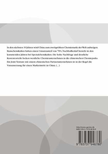 In den nächsten 10 Jahren wird China zum zweitgrößten Chemiemarkt der Welt aufsteigen. Basischemikalien haben einen Umsatzanteil von 70%; Nachholbedarf besteht in den kommenden Jahren bei Spezialchemikalien. Die hohe Nachfrage und deutliche Kostenvorteile locken westliche Chemieunternehmen in die chinesischen Chemieparks. Ein Joint Venture mit einem chinesischen Partnerunternehmen ist in der Regel die Voraussetzung für einen Markteintritt in China. Auch die deutschen Chemiekonzerne investieren seit Jahren kräftig im Reich der Mitte.