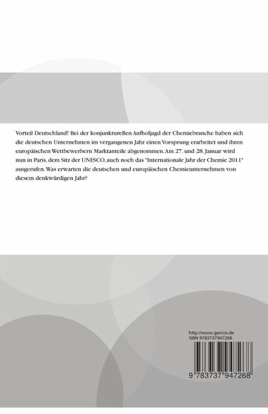 Vorteil Deutschland! Bei der konjunkturellen Aufholjagd der Chemiebranche haben sich die deutschen Unternehmen im vergangenen Jahr einen Vorsprung erarbeitet und ihren europäischen Wettbewerbern Marktanteile abgenommen. Am 27. und 28. Januar wird nun in Paris, dem Sitz der UNESCO, auch noch das "Internationale Jahr der Chemie 2011" ausgerufen. Was erwarten die deutschen und europäischen Chemieunternehmen von diesem denkwürdigen Jahr?