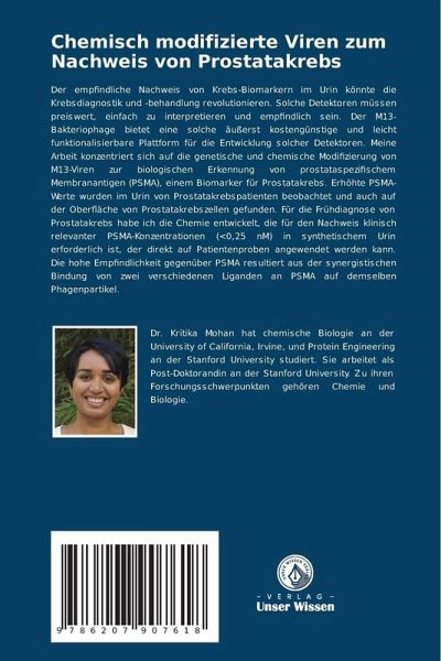 Der empfindliche Nachweis von Krebs-Biomarkern im Urin könnte die Krebsdiagnostik und -behandlung revolutionieren. Solche Detektoren müssen preiswert, einfach zu interpretieren und empfindlich sein. Der M13-Bakteriophage bietet eine solche äußerst kostengünstige und leicht funktionalisierbare Plattform für die Entwicklung solcher Detektoren. Meine Arbeit konzentriert sich auf die genetische und chemische Modifizierung von M13-Viren zur biologischen Erkennung von prostataspezifischem Membranantigen (PSMA), einem Biomarker für Prostatakrebs. Erhöhte PSMA-Werte wurden im Urin von Prostatakrebspatienten beobachtet und auch auf der Oberfläche von Prostatakrebszellen gefunden. Für die Frühdiagnose von Prostatakrebs habe ich die Chemie entwickelt, die für den Nachweis klinisch relevanter PSMA-Konzentrationen (<0,25 nM) in synthetischem Urin erforderlich ist, der direkt auf Patientenproben angewendet werden kann. Die hohe Empfindlichkeit gegenüber PSMA resultiert aus der synergistischen Bindung von zwei verschiedenen Liganden an PSMA auf demselben Phagenpartikel.