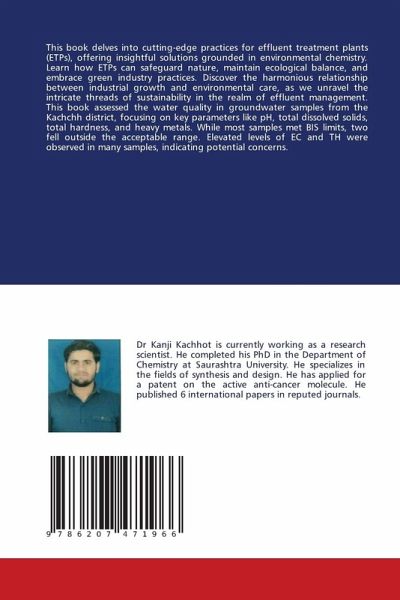 This book delves into cutting-edge practices for effluent treatment plants (ETPs), offering insightful solutions grounded in environmental chemistry. Learn how ETPs can safeguard nature, maintain ecological balance, and embrace green industry practices. Discover the harmonious relationship between industrial growth and environmental care, as we unravel the intricate threads of sustainability in the realm of effluent management. This book assessed the water quality in groundwater samples from the Kachchh district, focusing on key parameters like pH, total dissolved solids, total hardness, and heavy metals. While most samples met BIS limits, two fell outside the acceptable range. Elevated levels of EC and TH were observed in many samples, indicating potential concerns.