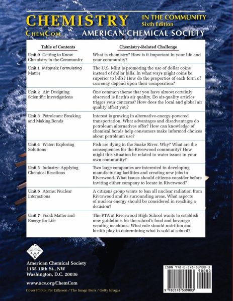 Students learn concepts on a need-to-know basis, evaluate data, and make decisions based on their observations and knowledge gained through the curriculum. The text features embedded labs and activities that give students the opportunity to apply their knowledge of chemistry. Each unit ends with an "putting it all together" (PIAT) activity, where students collaborate and use their knowledge gained throughout the chapter, both chemistry and real-life scenarios, to evaluate a potentially real-life problem. Visit the website for more information: http://www.acs.org/chemcom This replaces the 6th edition published by W.H. Freeman ISBN-13: 978-1429219525 ISBN-10: 1429219521