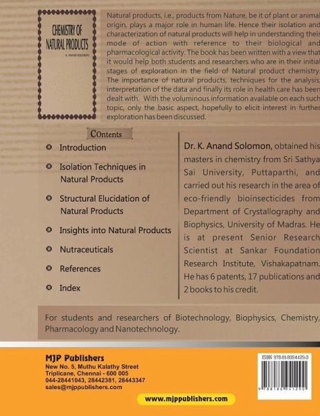 Natural products, i.e., products from Nature, be it of plant or animal origin, plays a major role in human life. Hence the isolation and characterization of natural products will help in understanding their mode of action with reference to their biological and pharmacological activity. The book has been written with a view that it would help both students and researchers who are in their nitial stages of exploration in the field of Natural product chemistry. With the oluminous information available on each such topic, only the basic aspect, hopefully to elicit interest in further exploration has been discussed.