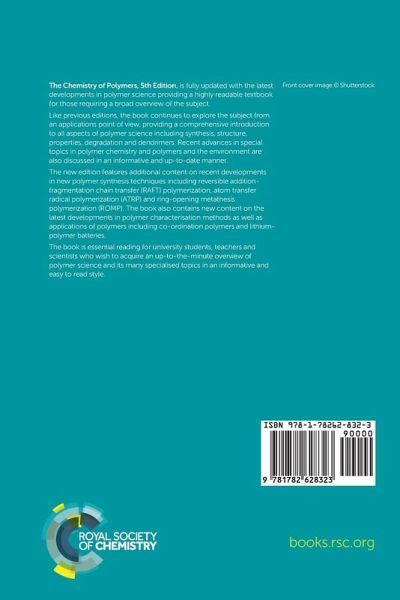 The Chemistry of Polymers, 5th Edition, is fully updated with the latest developments in polymer science providing a highly readable textbook for those requiring a broad overview of the subject. Like previous editions, the book continues to explore the subject from an applications point of view, providing a comprehensive introduction to all aspects of polymer science including synthesis, structure, properties, degradation and dendrimers. Recent advances in special topics in polymer chemistry and polymers and the environment are also discussed in an informative and up-to-date manner. The new edition features additional content on recent developments in new polymer synthesis techniques including reversible addition-fragmentation chain transfer (RAFT) polymerization, atom transfer radical polymerization (ATRP) and ring-opening metathesis polymerization (ROMP). The book also contains new content on the latest developments in polymer characterisation methods as well as applications of polymers including co-ordination polymers and lithium-polymer batteries. The book is essential reading for university students, teachers and scientists who wish to acquire an up-to-the-minute overview of polymer science and its many specialised topics in an informative and easy to read style.