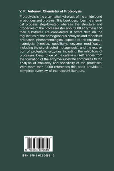 1 Substrates.- 1.1 General Characteristics.- 1.2 Amide Group.- 1.3 Unusual (Nonpeptide) Amide Bonds and Other Bonds of Carboxylic Acid Derivatives.- 1.4 Derivatives of Amino Acids and Peptides.- 1.5 Proteins as Substrates of Proteases.- 1.6 Water.- 1.7 Conclusion.- 2 Enzymes.- 2.1 Classification.- 2.2 Distribution.- 2.3 Characteristics of Certain Types of Amide Hydrolases.- 2.4 Primary Structure.- 2.5 Spatial Structure.- 2.6 Active Sites.- 2.7 Conformational Mobility of Enzymes.- 2.8 Proteolytic Activity of Enzymes Other than Amide Hydrolases. Catalytically Active Antibodies.- 2.9 Conclusion.- 3 Nonenzymatic Hydrolysis. Models.- 3.1 Thermodynamics.- 3.2 Kinetics.- 3.3 Mechanism.- 3.4 Catalysis.- 3.5 Conclusion.- 4 Enzyme Hydrolysis. Phenomenology.- 4.1 Enzyme Kinetics.- 4.2 Relationship of Rate and Equilibrium.- 4.3 Specificity.- 4.3.3 Stereospecificity.- 4.4 Efficiency.- 4.5 Comparison of Amide Hydrolase Efficiency and Specificity.- 4.6 Effect of Amide Hydrolases Modification on the Activity.- 4.7 Synthetic Activity of Amide Hydrolases.- 4.8 Unusual and Side Reactions Catalyzed by Amide Hydrolases.- 4.9 Conclusion.- 5 Regulation and Effect of External Factors.- 5.1 Zymogens and Their Activation.- 5.2 The Influence of pH.- 5.3 The Influence of Ions and Ionic Strength of the Solution.- 5.4 The Effect of Organic Solvents.- 5.5 The Kinetic Isotope Effect of the Solvent.- 5.6 The Effect of Temperature and Pressure.- 5.7 Cryoenzymology of Amide Hydrolases.- 5.8 Micellar Enzymology.- 5.9 Inhibitors.- 5.10 Activation.- 5.11 Allosteric Effectors.- 5.12 Autolysis.- 5.13 Conclusion.- 6 Enzyme-Substrate Complexes.- 6.1 The Forces of Interaction.- 6.2 Kinetics of the Complex Formation.- 6.3 Thermodynamics.- 6.4 Conformational Changes.- 6.5 Structure of the Complexes.- 6.6 Evaluation of the Overall Energy of the Enzyme-Substrate Interaction.- 6.7 Conclusion.- 7 Chemical Transformation of the Substrate.- 7.1 The State of Catalytically Active Groups.- 7.2 The Charge Relay System.- 7.3 The State of the Cleavable Substrate Group.- 7.4 Covalent or General Base Catalysis?.- 7.5 Electrophile.- 7.6 Nucleophilic Attack. Elementary Step.- 7.7 Tetrahedral Intermediate.- 7.8 Proton Transfer and Decomposition of Tetrahedral Intermediate.- 7.9 Acylenzymes and Enzyme-Product Complexes.- 7.10 Comparison of Enzymatic Hydrolysis Mechanisms.- 7.11 Some Aspects of Evolution of Chemical Mechanisms of Amide Hydrolases.- 7.12 Conclusion.- 8 Specificity and Efficiency. Concepts and Hypotheses.- 8.1 General Considerations.- 8.2 Factors of Catalysis.- 8.3 Theories and Hypotheses. Destabilization of the Ground State.- 8.4 Stabilization of the Transition State.- 8.5 Enzyme - "Machine".- 8.6 Quantum-Chemical Description of Enzymatic Reactions.- 8.7 "Ideal" Enzyme.- 8.8 Ground State of the Elementary Step of Enzymatic and Model Reactions.- 8.9 Enzyme Does Not Decrease Activation Energy of the Elementary Step of the Chemical Reaction.- 8.10 Approaches to the General Theory of Proteolysis.- 8.11 Conclusion.- References.