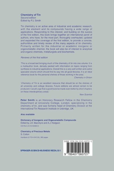 about the first edition: `Chemistry of Tin is an excellent resource that should be on the shelves of all university and college libraries... Future editions are almost certain to be produced; I would urge that a good book be made even better by short chapters on these interdisciplinary areas.' New Scientist `This is a broad text bringing much of the chemistry of tin into one volume. It is a multiauthor book, densely packed with information on topics ranging from synthesis to industrial applications. Overall, this is a very well written and useful specialist volume which should find its way into all good libraries. It is an ideal reference book for the personal shelves of those working in the area.' Chemistry in Britain
